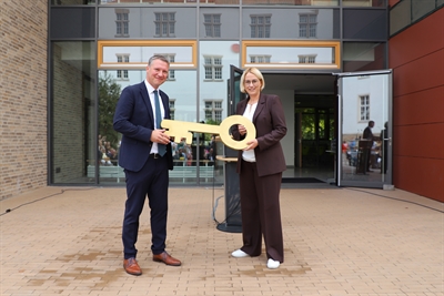 Oberbürgermeisterin Katharina Pötter und Schulleiter Sebastian Bröcker bei der symbolischen Schlüsselübergabe für den Erweiterungsbau des Ratsgymnasiums.