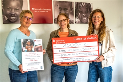 Fachbereichsleiterin Kerstin Schlüter (Mitte) und Sophie Bardelmeier (Projektmanagerin im Fachbereich für Kinder, Jugendliche und Familien/ rechts im Bild) übergaben den symbolischen Scheck an Doris Wächter (links) von terre des hommes.