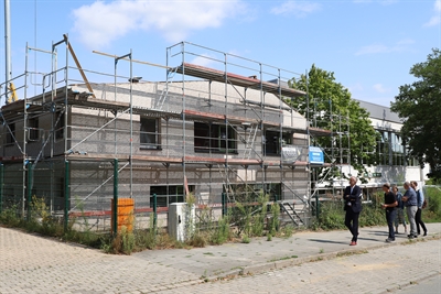 Alt und neu: Vorn ist bereits das Erdgeschoss des Neubaus zu erkennen. Das Bestandsgebäude im Hintergrund wird entkernt und vollständig saniert.