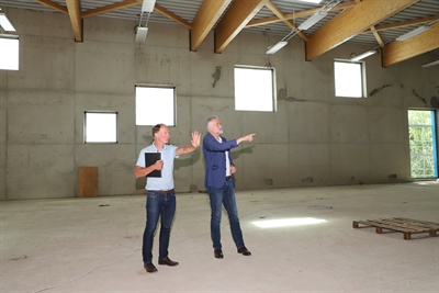 Hier herrschen ab Ende des Jahres ideale Bedingungen zum Sporttreiben. Oberbürgermeister Wolfgang Griesert (rechts) und Ludger Rasche vom städtischen Eigenbetrieb Immobilien- und Gebäudemanagement inspizieren die Fortschritte beim Bau der neuen Sporthalle in Lüstringen.