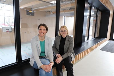 Wer die Mensa der Diesterwegschule betritt, kann durch das große Fenster, vor dem Schulleiterin Elke Schwarzkopf (links) und Oberbürgermeisterin Katharina Pötter sitzen, in die Sporthalle schauen.