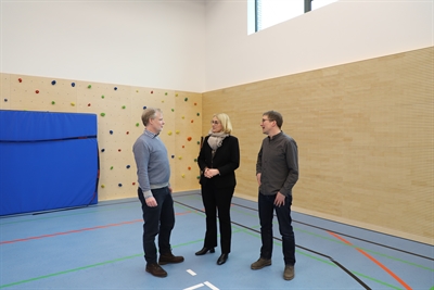 Fachgespräch vor der Boulderwand: (von links) Schulleiter Carsten Böing, Oberbürgermeisterin Katharina Pötter und Holger Diekmann, Bauleiter vom städtischen Eigenbetrieb Immobilien- und Gebäudemanagement sprechen über die vielen Vorzüge der neuen Halle.