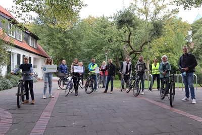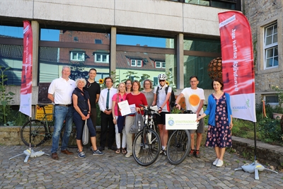 Zufriedene Gesichter: Beim Stadtradeln gab es in diesem Jahr sowohl bei der Anzahl der Teilnehmer als auch bei den gefahrenen Kilometern Rekorde. Als radaktivste Schule wurde die Grundschule am Schölerberg ausgezeichnet. Die größte Distanz legte Britta Albers (3.v.r.) zurück, Achim Kaufmann landete auf Rang 2 (2.v.r.).