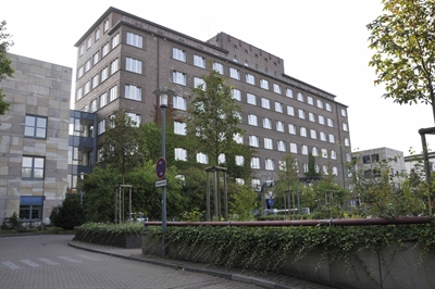 Oberbürgermeister Wolfgang Griesert bei der Besichtigung: Links ist die Aula, die die Elisabeth-Siegel-Schule und das Sophie-Scholl-Abendgymnasium mit-einander verbindet und die bereits eine moderne Fassade bekommen hat. Am Gebäude im Hintergrund stehen die Arbeiten noch an.