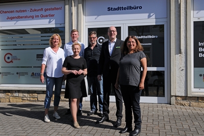 Sie stellen das neue Stadtteilbüro vor, in dem Vertreter von drei Fachbereichen unter einem Dach eine Anlaufstelle bilden: (v.l.) Ute Fritsch-Riepe (Fachbereich Umwelt und Klimaschutz), Nils Bollhorn (Fachdienst Jugend), Anja Prüssner (Fachbereich Städtebau), Marco Brockmann (Fachdienst Jugend), Stadtrat Wolfgang Beckermann und Sevim Karakaya (Fachdienst Jugend).