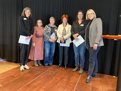Teilnehmer des Fachtages Kinderschutz: Wolfgang Ruthemeier, Leiter des Fachdienstes Familie - Sozialer Dienst bei der Stadt Osnabrück, Rita Alte-Bornholt; Kinderschutz-Koordinatorin der Stadt Osnabrück, Fachdienst Familie - Sozialer Dienst; Dr. med. Angelika Niemann-Pilatus, die Vorsitzende des Arbeitskreises Kinderschutz der Stadt Osnabrück sowie Maike Ahlrichs und Melanie Stolze von der Polizeiinspektion Osnabrück. Foto: Stadt Osnabrück, Silke Brickwedde