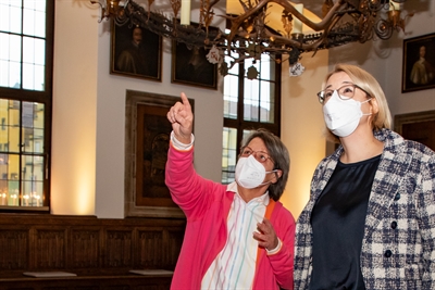 Hier kennt sie sich bestens aus und kann sogar Oberbürgermeisterin Katharina Pötter noch mit interessanten Hintergründen zu den Gesandten auf den Porträts überraschen: Renate Frankenberg (links) im Friedenssaal des historischen Rathauses.