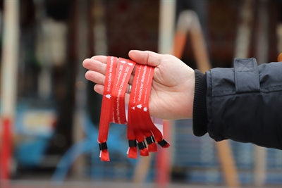 Auf dem Weihnachtsmarkt gilt in diesem Jahr die 2G-Regel. Dass man geimpft oder genesen ist, muss man nachweisen, indem man ein solches Bändchen trägt.