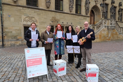 Vorfreude auf das Friedenssingen: Matthis Holthaus (Projektbüro Kultur links), Johannes Hartig (Sparkassenstiftung), Patricia Mersinger (Leiterin Fachbereich Kultur), Silke Buttmann und Anke Bramlage (Projektbüro Kultur) sowie Erster Stadtrat Wolfgang Beckermann (rechts).