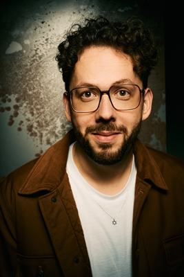 Sebastian Wells und Vsevolod Kazarin (auf dem Smartphone), Preisträger des Deutschen Friedenspreis für Fotografie 2023), vor ihrer Arbeit „Young People Photographed in Kyiv, April and May 2022“
