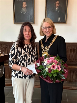 Oberbürgermeisterin Katharina Pötter überreicht Dr. Gisela Löhberg im Auftrag des Bundespräsidenten Frank-Walter Steinmeier das Bundesverdienstkreuz.
