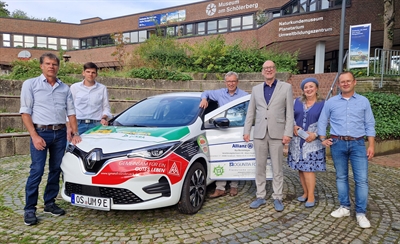 Sponsorinnen und Sponsoren, Erster Stadtrat Wolfgang Beckermann und Museumleiter Norbert Niedernostheide begutachten das neue Elektroauto. Von links: Ralf Zielinski (Prüftechnik Zielinski + Lünne GmbH), Mark Honerkamp (DEKRA Osnabrück), Norbert Niedernostheide (Museum am Schölerberg), Erster Stadtrat Wolfgang Beckermann, Angelina Riedel-Böhm (FBO-Fahrschule Böhm Osnabrück), Sascha Lübke (Compass Immobilienverwaltung).