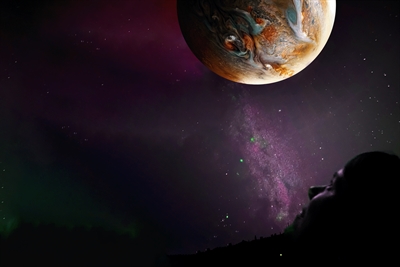 Künstlerische Darstellung des Anblicks, wie er sich einem Beobachter auf dem Jupitermond Europa bieten könnte.