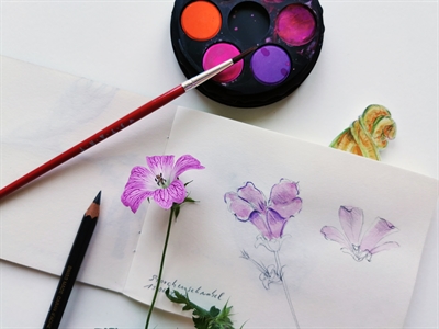 Blumen wie den Storchschnabel finden Teilnehmer:innen des Zeichenworkshops im Naturgarten des Museums am Schölerberg und verewigen sie in einem Skizzenbuch.