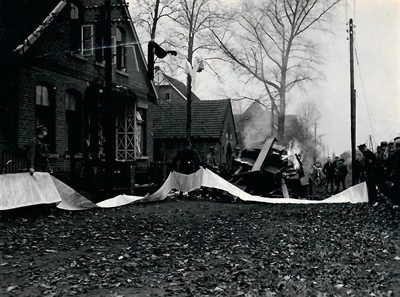 SA- und SS-Männer posieren am 10. November 1938 in Fürstenau mit der Thorarolle vor dem angezündeten Inventar des jüdischen Gebetsraumes.