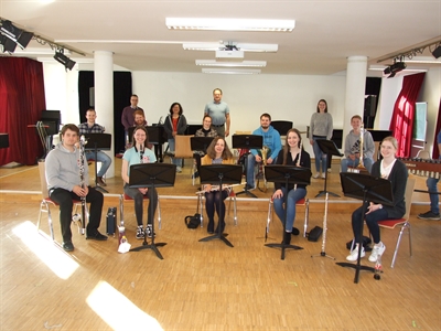 Teilnehmerinnen und Teilnehmer des Lehrgangs mit dem Dozenten-Team Leonardo Grani (Musik- und Kunstschule Osnabrück), Michiko Sugizaki (Musik- und Kunstschule Osnabrück, Vertretung für den erkrankten Lehrgangsleiter Heiko Maschmann), Hans-Bernd Lorenz (Landesmusikdirektor Blasmusik) und Lena Nelles (Kreismusikverband Osnabrücker Land).