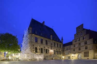 Das Osnabrücker Rathaus, Stätte des Westfälischen Friedens, im Oktober 2023. Links ist die Installation „forx“ zu sehen, die der Künstler Volker-Johannes Trieb zum Friedensjubiläum beisteuerte.