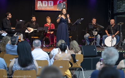 Die Musikerinnen und Musiker des Atatürk Kultur- und Bildungsvereins spielen zum Opferfest im Haus der Jugend. Es ist ein stimmungsvoller Abend im Innenhof.