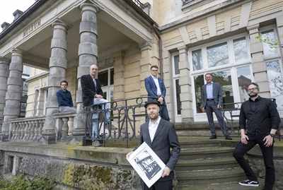 Von rechts (!) nach links: Dr. Sebastian Weitkamp (Gedenkstätte Esterwegen), Dr. Michael Gander (Gedenkstätten Gestapokeller und Augustaschacht) und Dr. Tobias Pischel de Ascensao (VHS Osnabrück) sowie Direktor Nils-Arne Kässens (vorne), Dr. Thorsten Heese und Daniel Gollmann (Museumsquartier Osnabrück) freuen sich über den Abschluss des Kooperationsvertrages.