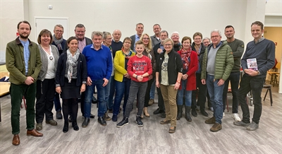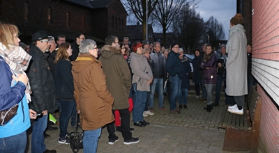 Vorstellung von Simon Böing-Messing (1.v.l.), der die Projektkoordination und den Aufbau zur Schaffung langfristiger Strukturen von ehrenamtlicher, grenzüberschreitender Arbeit in Suderwick und Dinxperlo seitens der Stadt Bocholt in den nächsten drei Jahren unterstützen wird (Gruppenfoto mit Suderwicker und Dinxperloer Bürger*innen: Stadt Bocholt, Henrike de Vries).