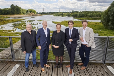 Gaben den Startschuss für das Projekt „E-BO(2)t“: (v.l.): Dr. Wilfried Plum (Geschäftsführer OWI Science for Fuels gGmbH), Oliver Luksic (Parlamentarischer Staatssekretär beim Bundesminister für Digitales und Verkehr), Dr. Frank Obenaus (Technischer Vorstand der Emschergenossenschaft), Dr. Frank-Andreas Weber (FiW e.V.) und Simon Pauli (Vice President Aspens GmbH).