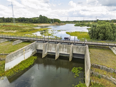 Dieses Bild verdeutlicht die Dimensionen des Hochwasserrückhaltebeckens Emscher-Auen - obowhl auf dieser Ansicht immer noch nur knapp die Hälfte des Beckens zu sehen ist. Im Vordergrund ist die gewaltige Drosselanlage, offiziell eine "Talsperre", zu sehen. Sie regelt den Durchfluss der Emscher. Winzig klein auf der Brücke auf dem Absperrbauwerk zu sehen sind (v.l.n.r.): Jörg Haberhausen (Emschergenossenschaft, Projektleiter), Dr. Frank Obenaus (Emschergenossenschaft, Vorstand für Wassermanagement und Technik), Liana Weismüller (Emschergenossenschaft, Vorständin für Personal und Nachhaltigkeit), Prof. Dr. Uli Paetzel (Emschergenossenschaft, Vorstandsvorsitzender) und Rajko Kravanja, Bürgermeister der Stadt Castrop-Rauxel.