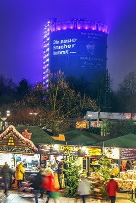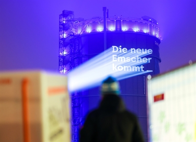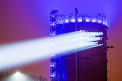 "Die neue Emscher kommt": Am Gasometer in Oberhausen wird die Abwasserfreiheit der Emscher bereits eingeläutet.