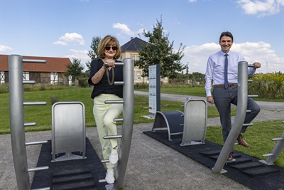 Professor Dr. Uli Paetzel, Vorstandsvorsitzender der Emschergenossenschaft, und Bettina am Orde, Geschäftsführerin der KNAPPSCHAFT, stellen die Trimm-Dich-Station vor.