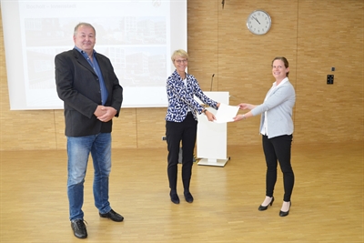 Förderbescheide übergeben (v.l.): Ulrich von Bruchhausen (Bezirksregierung Münster), Regierungspräsidentin Dorothee Feller und Bocholts Stadtplanerin Odette Wiese.