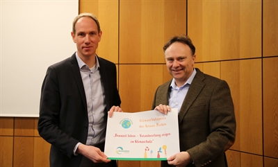 Der Klimaschutzpreis 2026 des Kreises Borken ist gestartet: Unter dem Titel „Klima macht Schule“ rufen Landrat Dr. Kai Zwicker (re.) und Stabsstellenleiter Michael Weitzell die Schulen zum Mitmachen auf