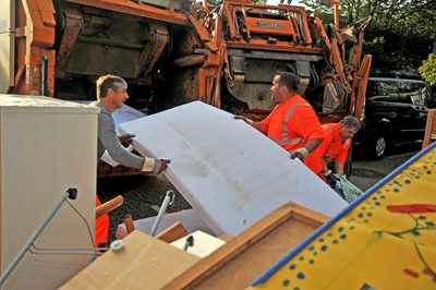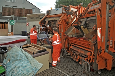 Ein Sperrmüllhaufen wird verladen. Der ESB holt mit drei Fahrzeugen den Sperrrmüll ab. Auf dem Foto sind die ESB Mitarbeiter Jürgen Lensing (links im Bild) und Alexander Gejl zu sehen.