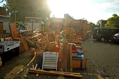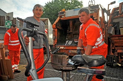 Die ESB Mitarbeiter Jürgen Lensing und Alexander Gejl werfen einen Metallstuhl in ein Fahrzeug.