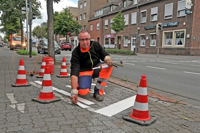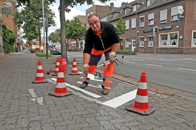 In regelmäßigen Abständen müssen abgenutzte Markierungen im Stadtgebiet erneuert werden. Martin Mölder ist einer der Experten der Straßenunterhaltung für diese spezielle Aufgabe.