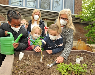 Die Kinder der OGS der Diepenbrockschule legen beim Pflanzen mit Unterstützung von Sigrid Alck (re) und Michaela Walber (hinen) selber Hand an und werden die Kästen auch betreuen, wenn diese künftig ihren Platz in der Rebenstraße gefunden haben - Foto: Bruno Wansing, Stadt Bocholt
