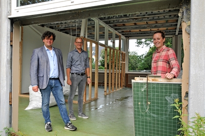 Der derzeitige Schulleiter des Grundschulverbunds Ludgerus, Benedikt Brömling, Stadtbaurat Daniel Zöhler und Architektin Nora Motejunas von der städtischen Gebäudewirtschaft (v.l.n.r.) in den Räumen der Pavillons, die zurzeit abgerissen werden - Foto: Bruno Wansing, Stadt Bocholt
