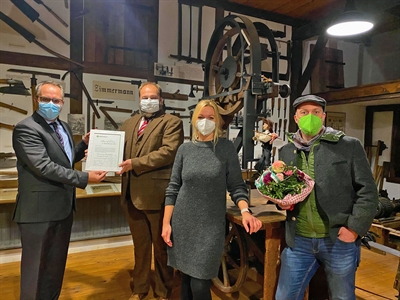 Bürgermeister Thomas Kerkhoff (l.) überreicht den Vorsitzenden Florian Sauret (2.v.l.) und Gerd Kempkes vom Handwerksmuseum die Siegerurkunde, Nina Kremer gratuliert.