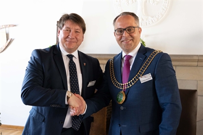 Vitalijus Mitrofanovas (hier gemeinsam mit Bocholts Bürgermeister Thomas Kerkhoff beim Empfang zum Europäischen Stadtfest am 14. Mai 2022) ist in Akmene erneut zum Bürgermeister gewählt worden.