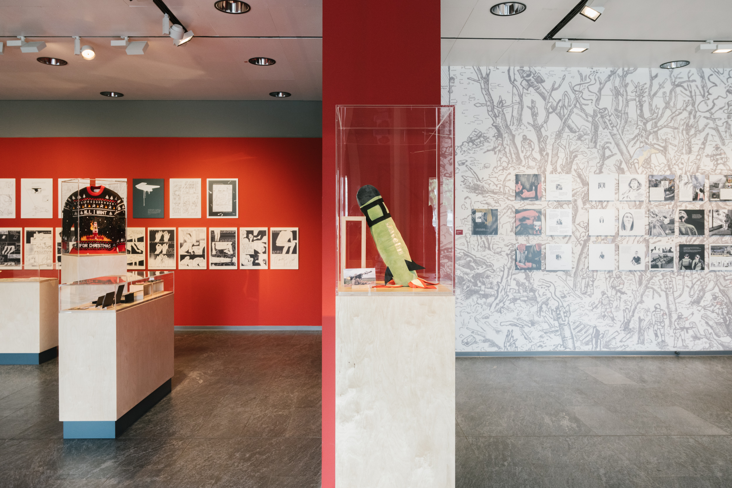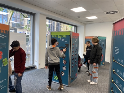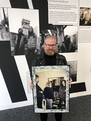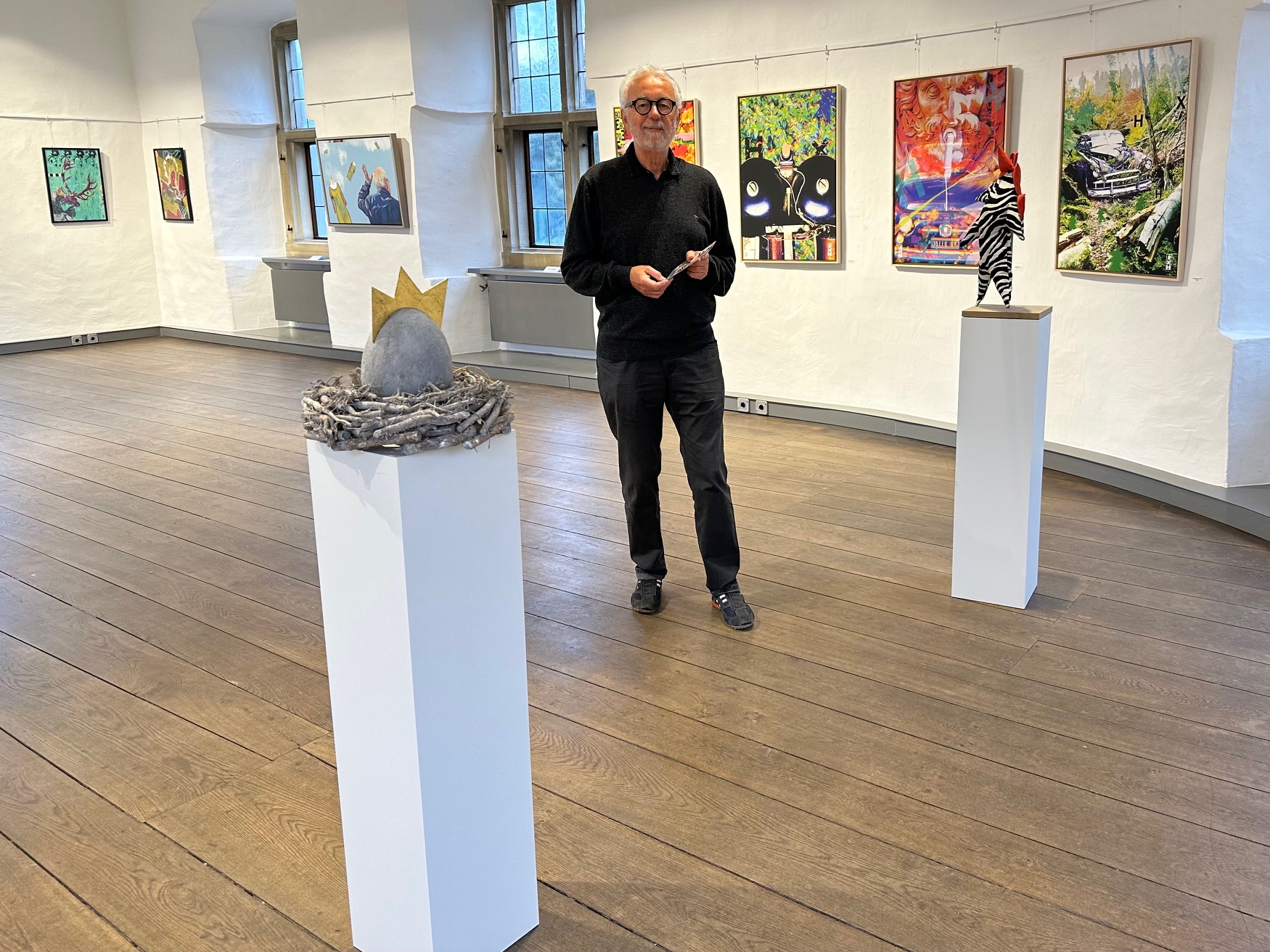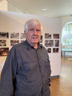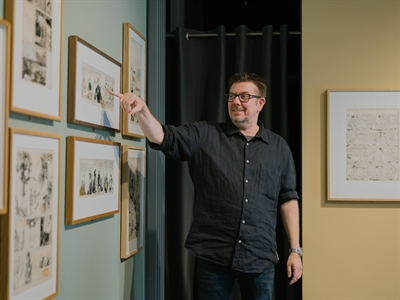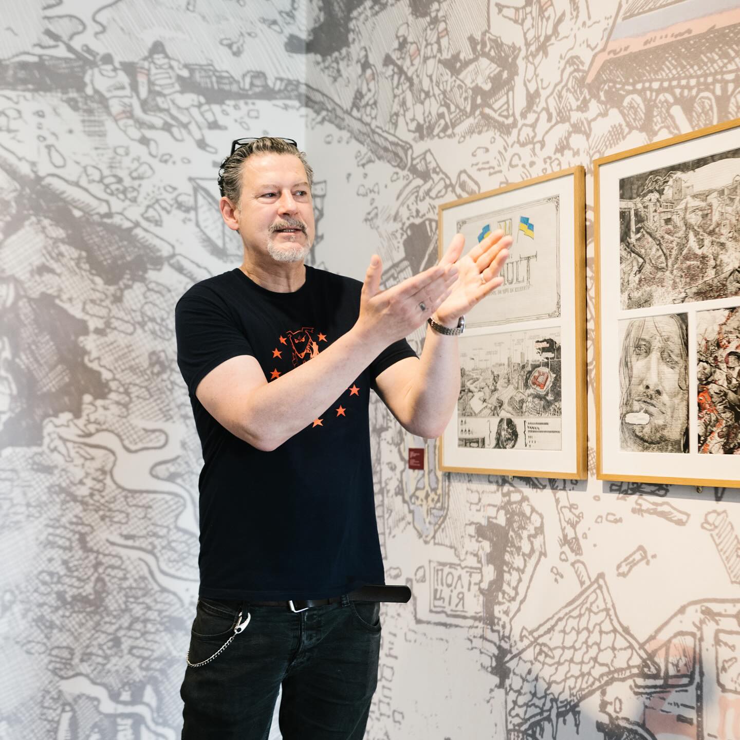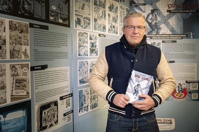 Nils Oskamp in der Ausstellung über seine Graphic Novel „Drei Steine“ in der JFS Eving.