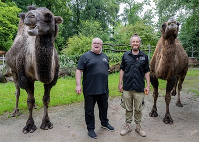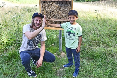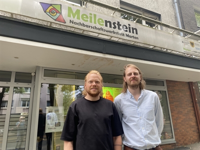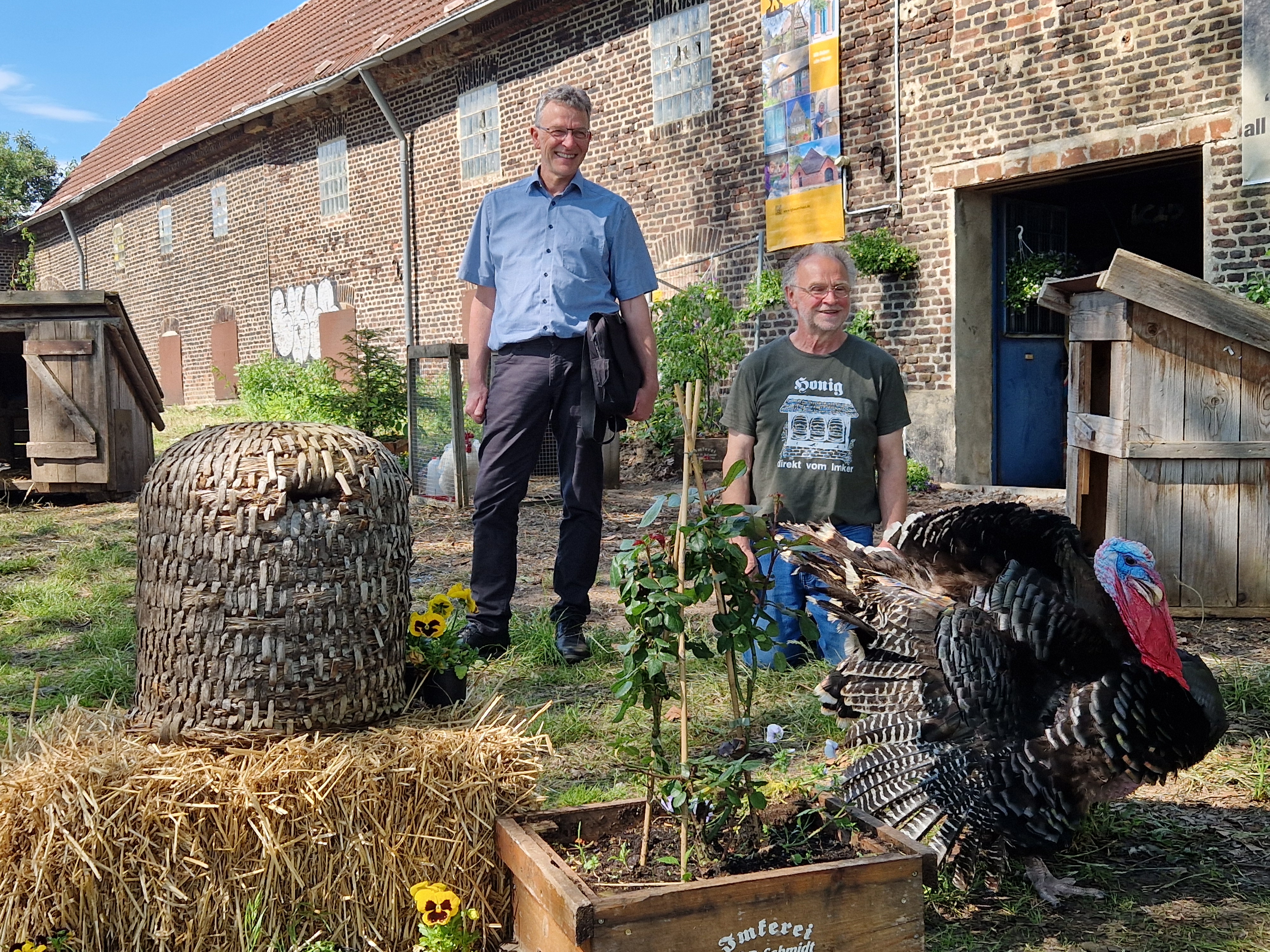 Detlef Niederquell, stellvertretender Leiter des Fachbereichs Liegenschaften (links im Bild) und Imker Ralf Schmidt freuen sich, dass der Hof Schulte-Somborn unerwartet eine Zukunft hat.