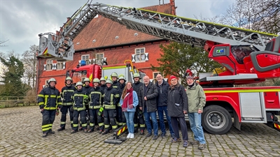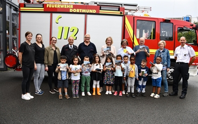 Jugenddezernentin Monika Nienaber-Willaredt (mittig) und Kinder der FABIDO-Kita Bornstraße zu Besuch auf der Feuerwache 1