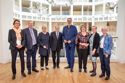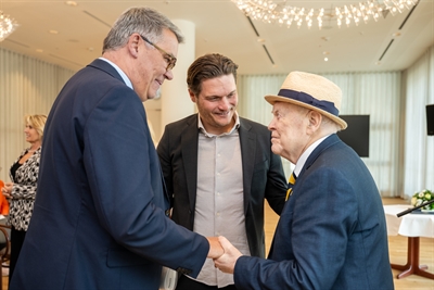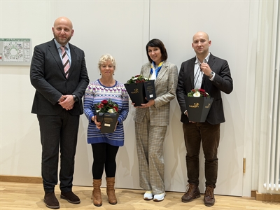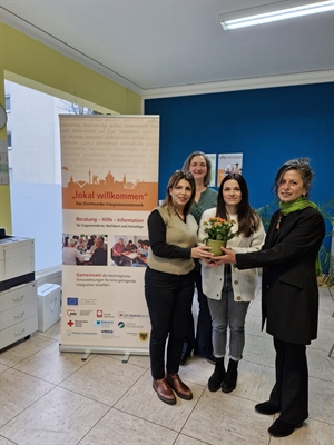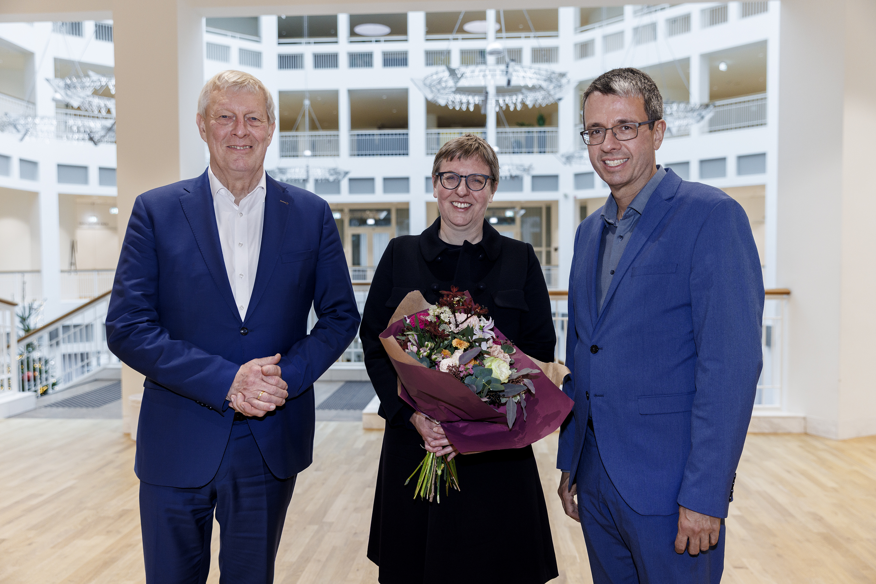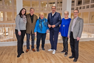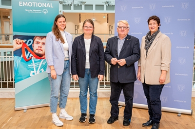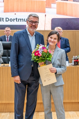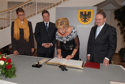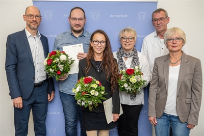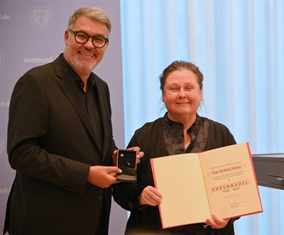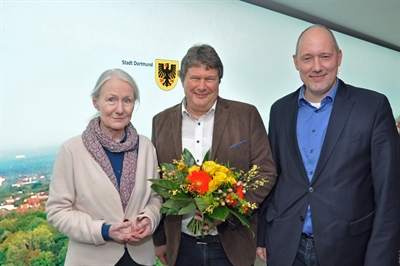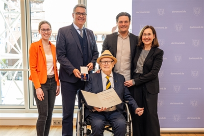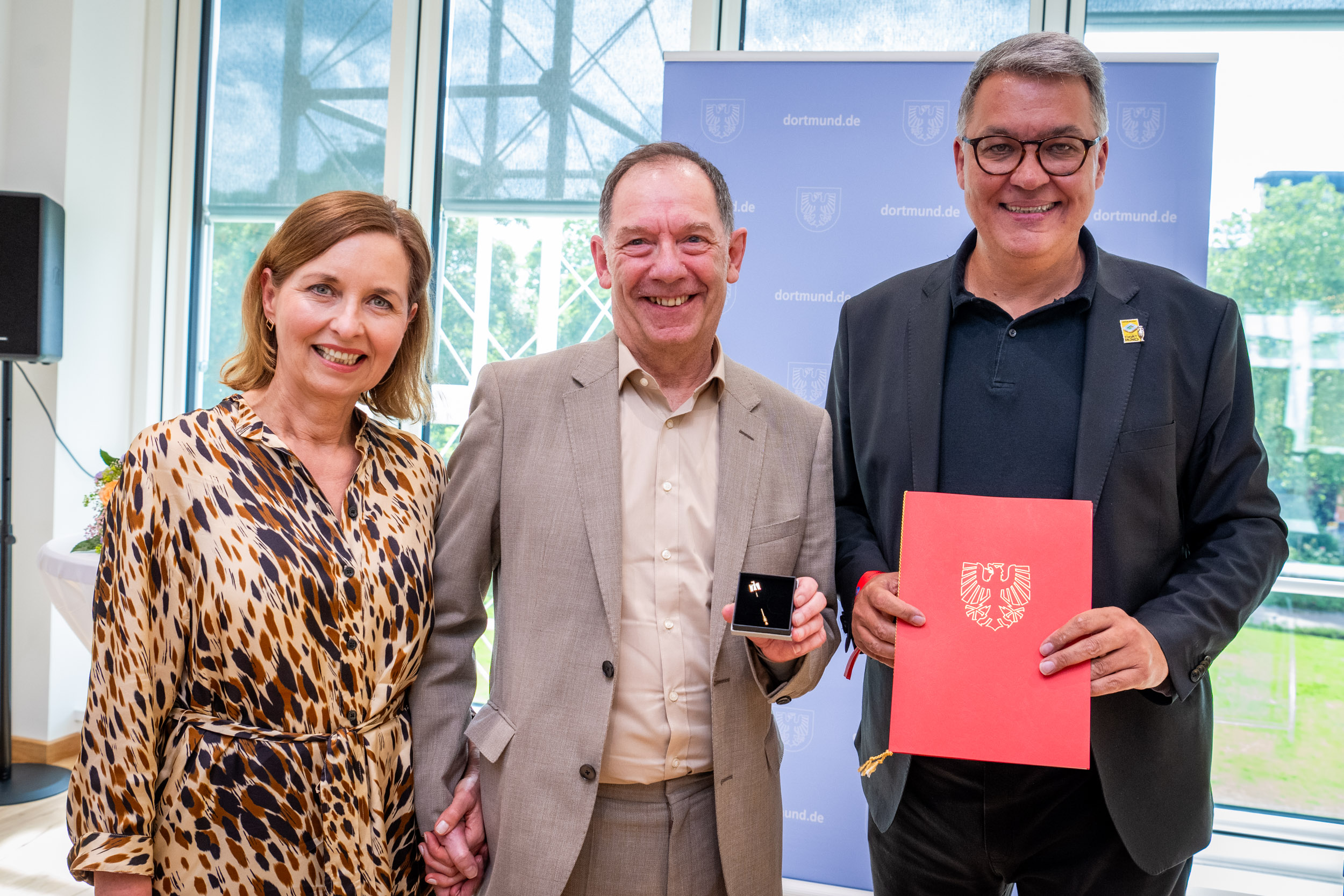 OB Alexander Kalouti (re) zeichnete im Rathaus drei verdiente Dortmunderinnen und Dortmunder mit der Ehrennadel aus (v.li.): Ursula Mehrfeld, Bruno Knust und Dr. Inke Arns.