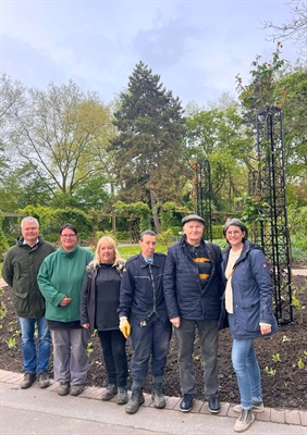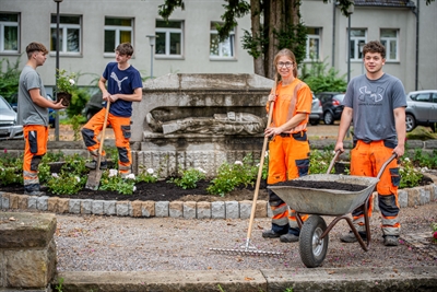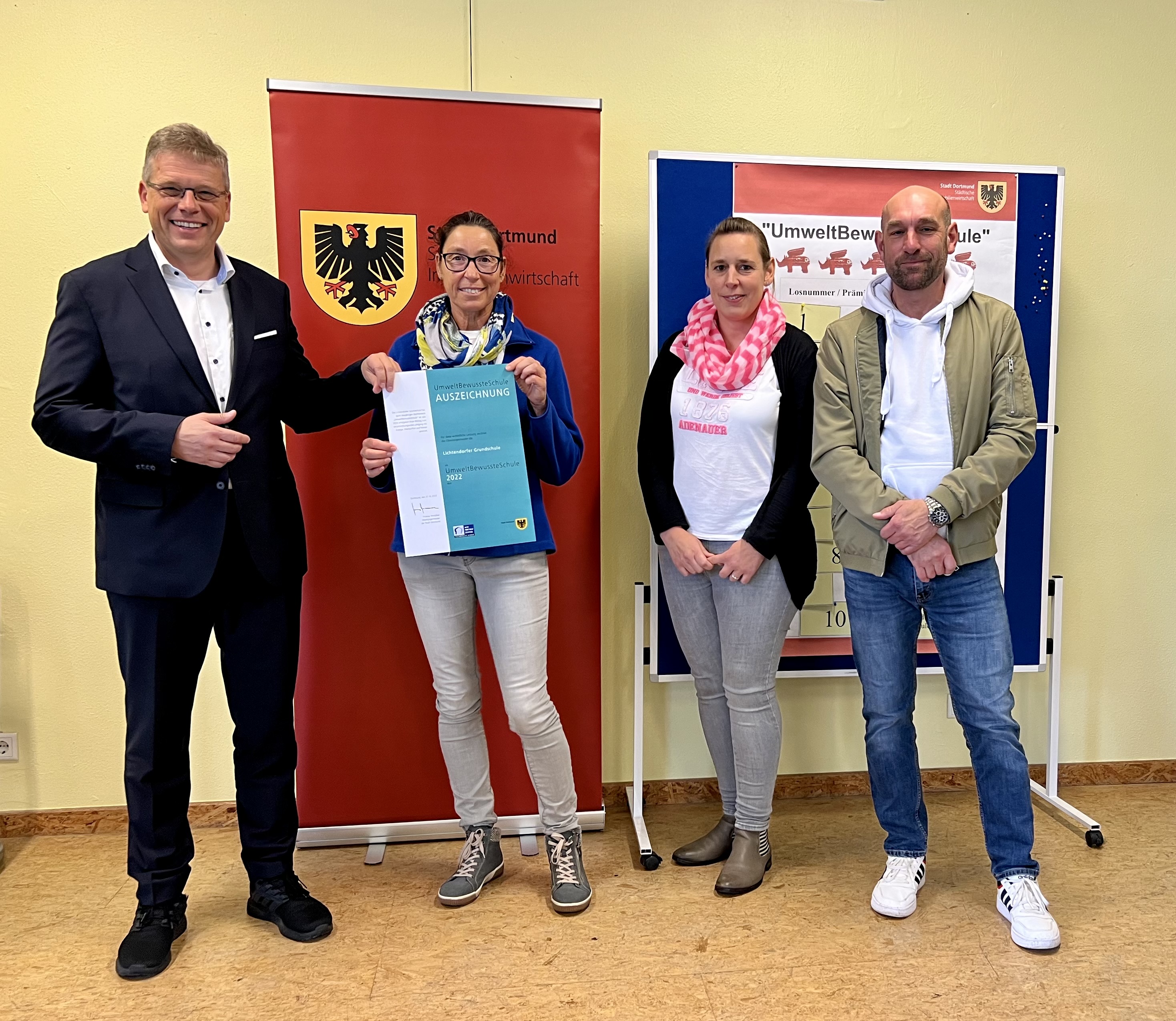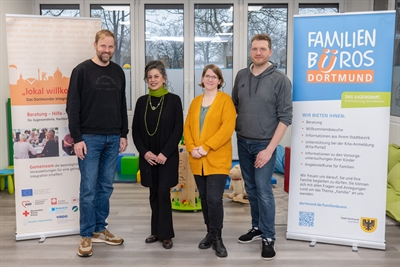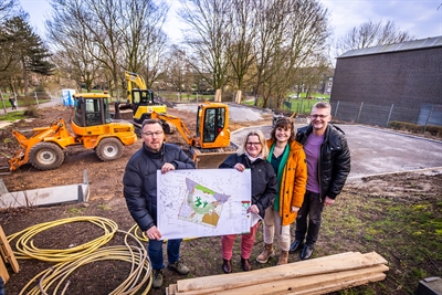 Im Sommer soll das neue Angebot für junge Menschen in Eving fertig sein. Bezirksbürgermeister Oliver Stens, Andrea Dasbeck-Pälchen, Lara Driller (beide Grünflächenamt) sowie Daniel Binder vom Büro für Kinder- und Jugendinteressen der Stadt Dortmund