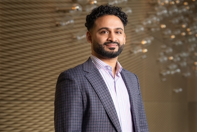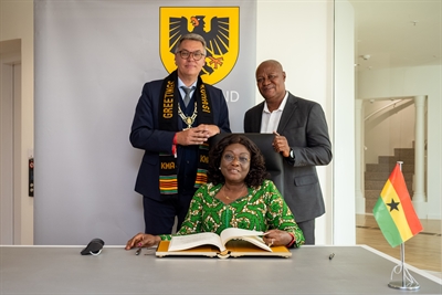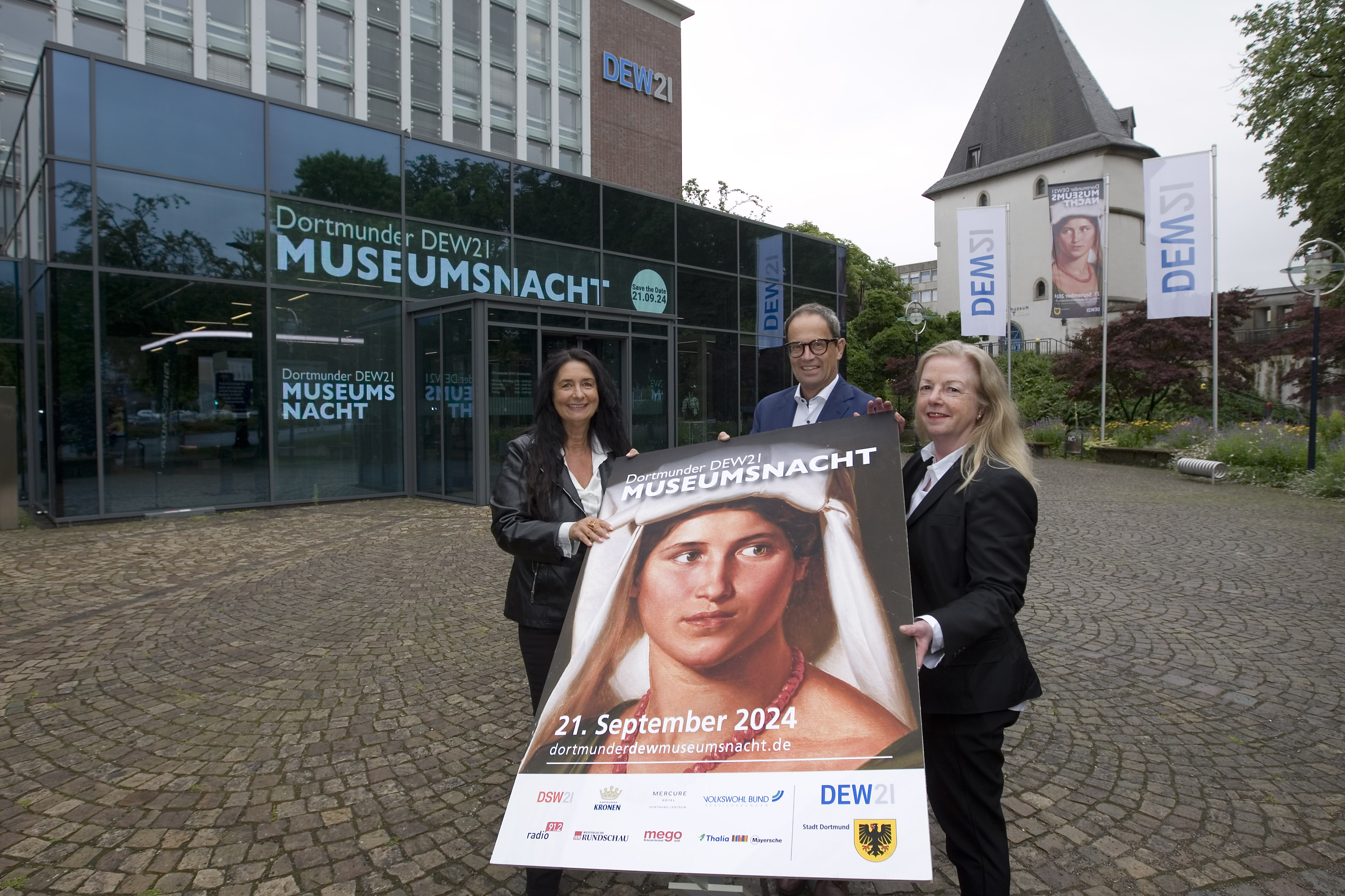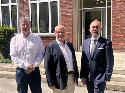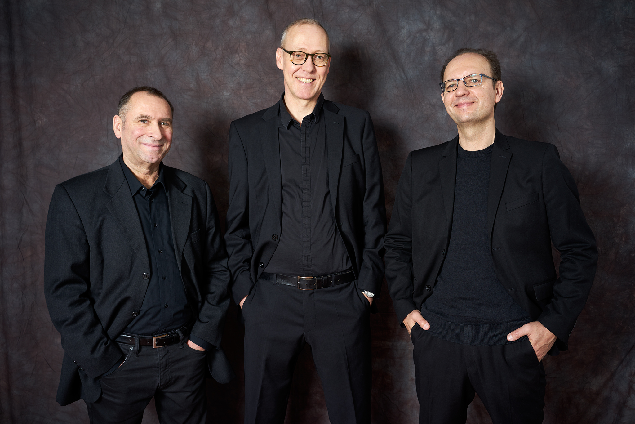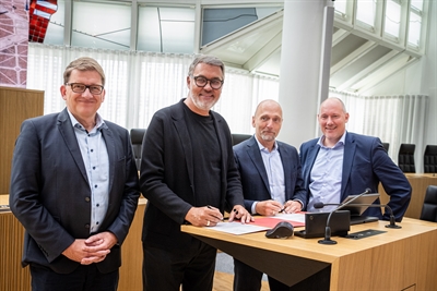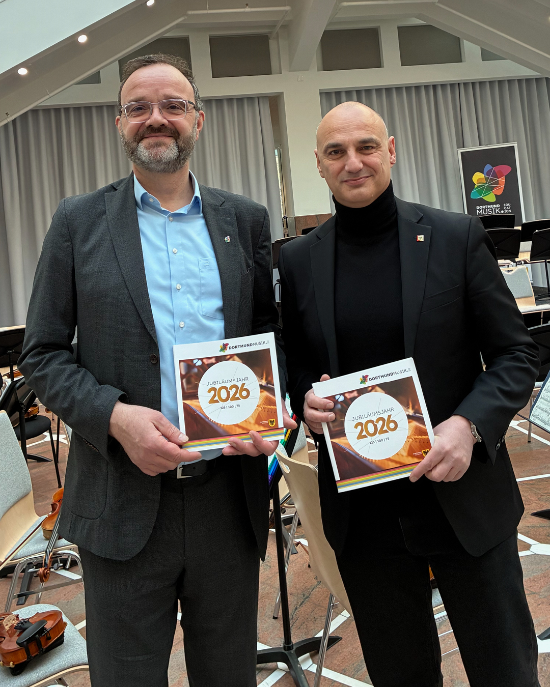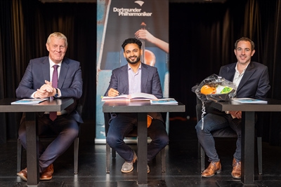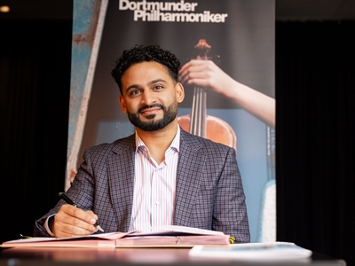 Kulturdezernent Jörg Stüdemann (li) und Tobias Ehinger (re) hießen den kommenden Generalmusikdirektor Jordan de Souza zur Vertragsunterzeichnung herzlich willkommen im Theater Dortmund.