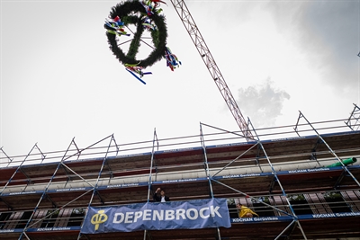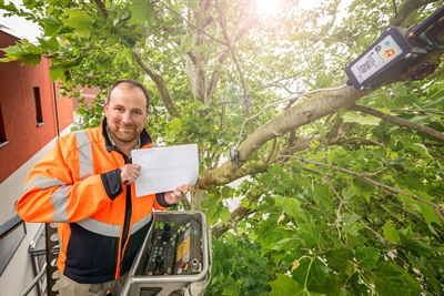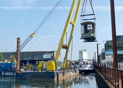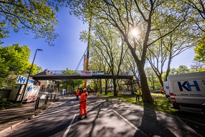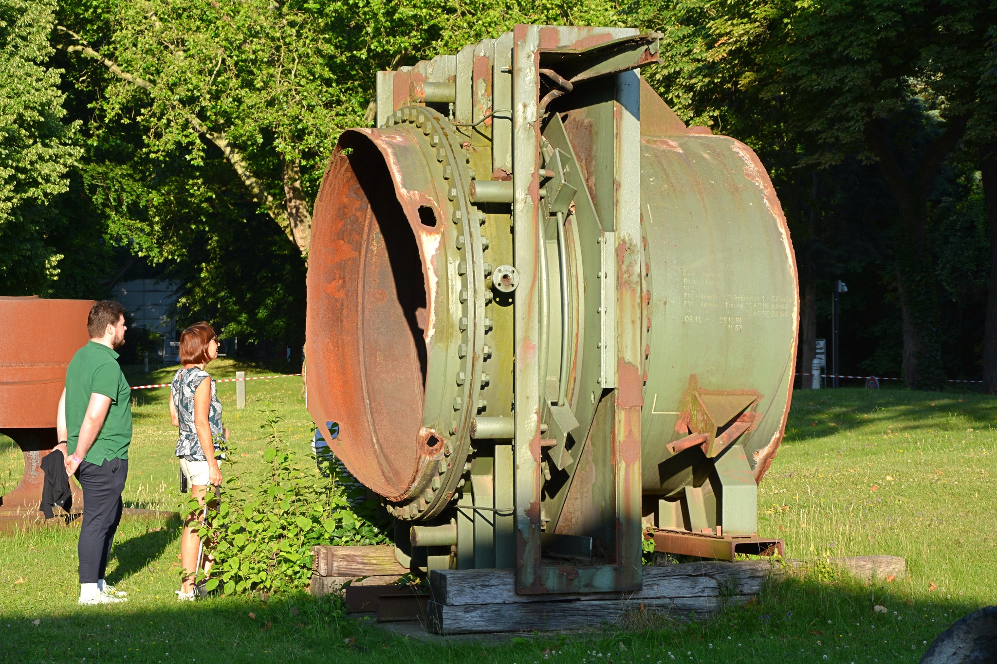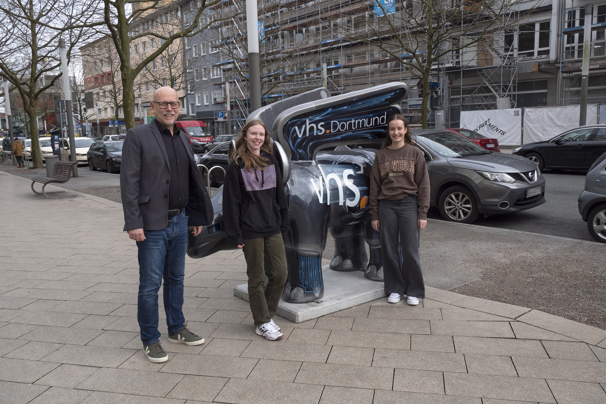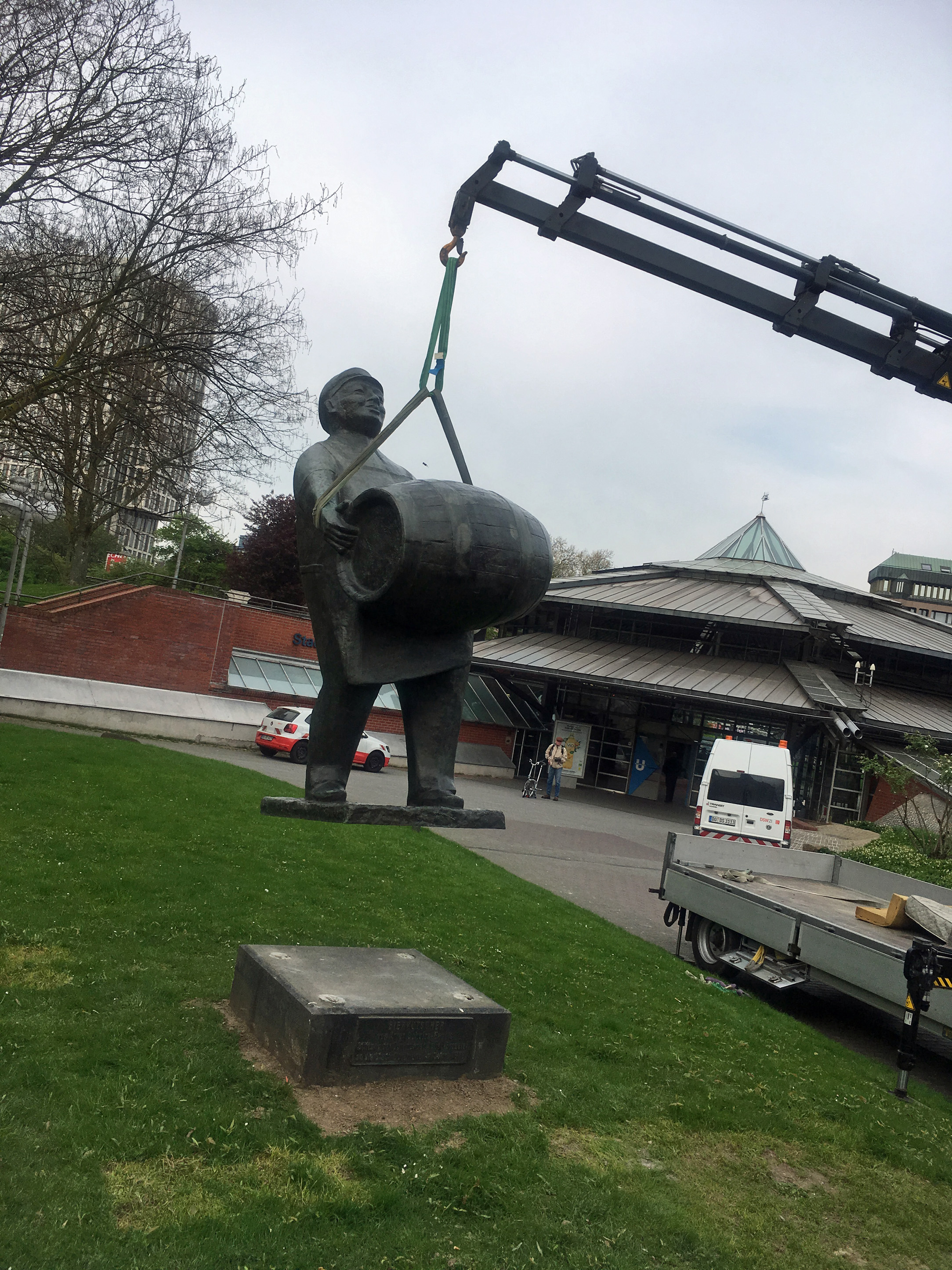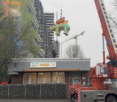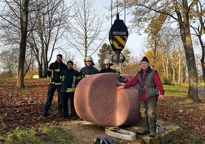 Die tatkräftige Unterstützung der Feuerwehr Dortmund (links) ermöglichte die Aufstellung der Skulptur des Künstlers Jan Bormann (rechts).