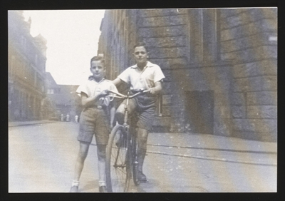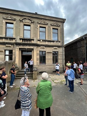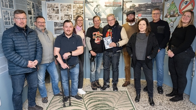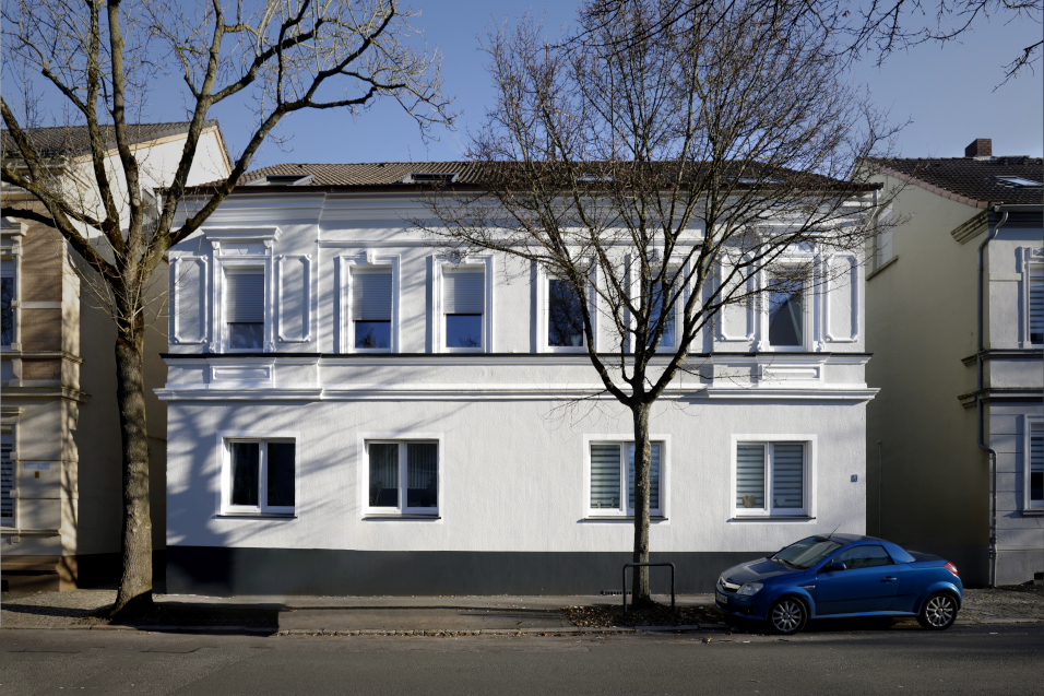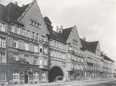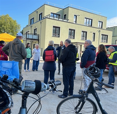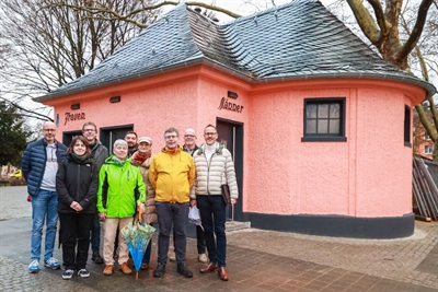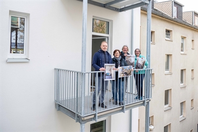 Nicht nur die Balkone sind neu. Die älteren Fotos zeigen, wie groß der Unterschied von früher zu heute ist. Personen v.l.: Sebastian Kröger (Leiter Amt für Stadterneuerung), Karola Stemmann (Fachbereich Liegenschaften), Jochen Tempel (Bauunternehmer und Eigentümer), Anja Wegmann (Fachbereich Liegenschaften).