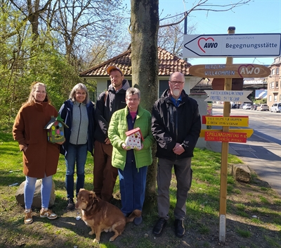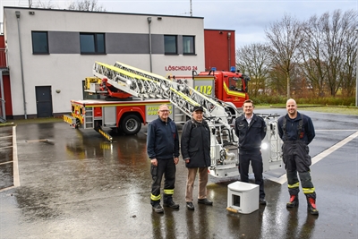Udo Henneke (Feuerwache 3, v. l.), Heinz Heitland (AGARD), Matthias Kleinhans (Pressestelle Feuerwehr Dortmund) und Benjamin Seemann (Feuerwache 3) vor dem Gerätehaus des Löschzugs 24 in Asseln mit dem Nistkasten für Turmfalken.