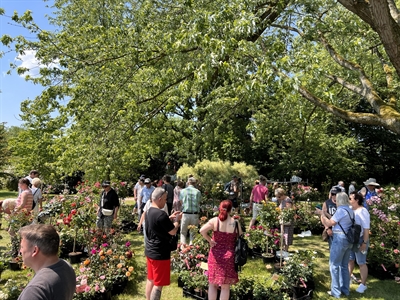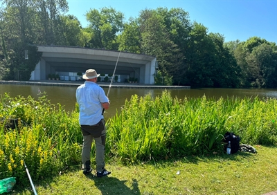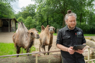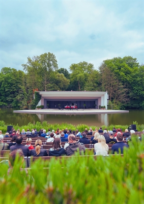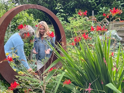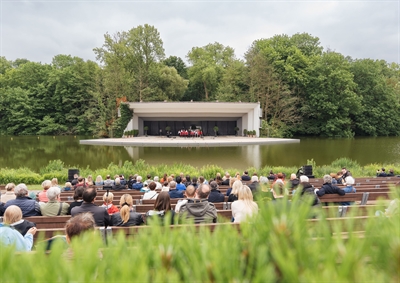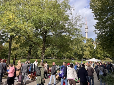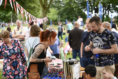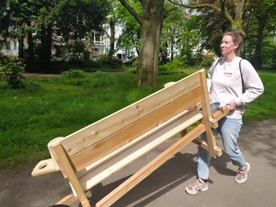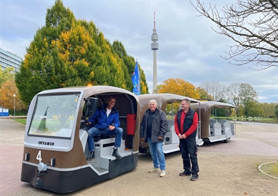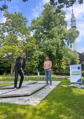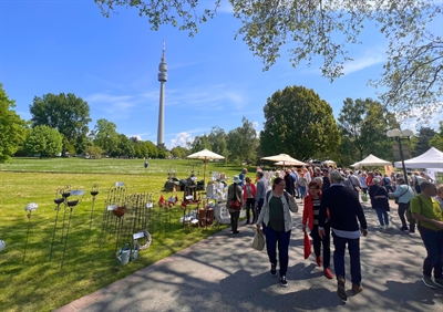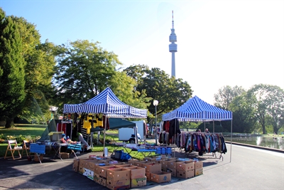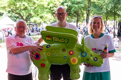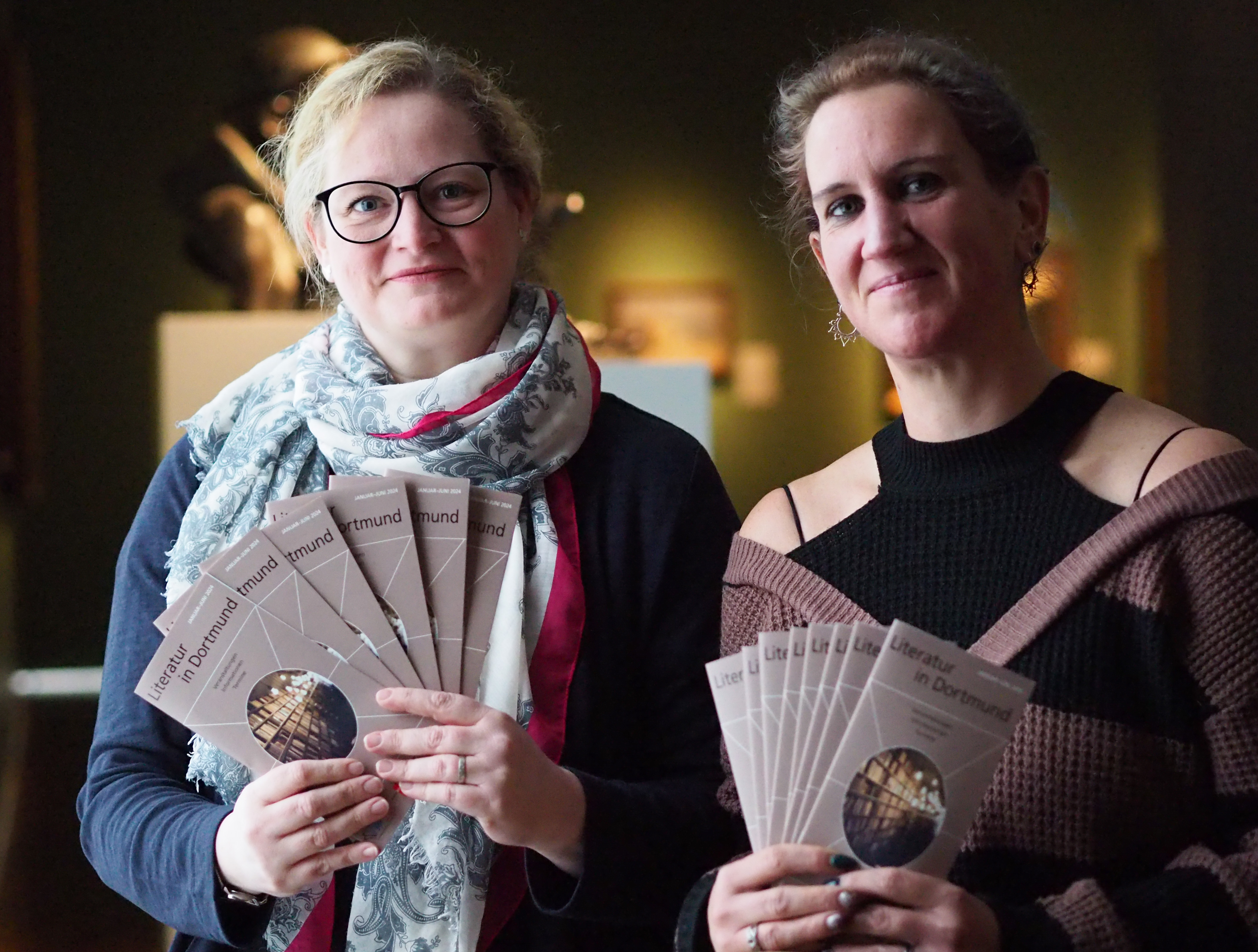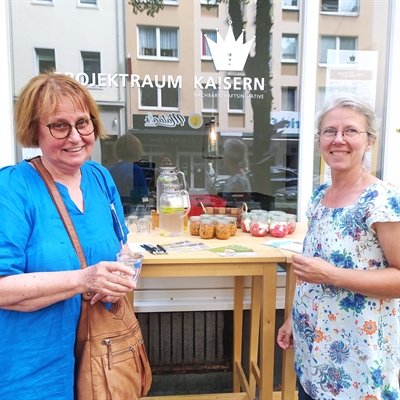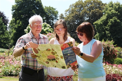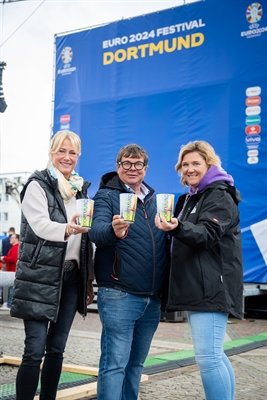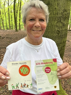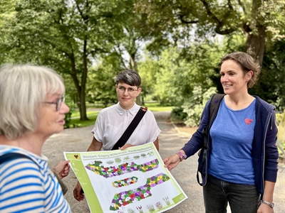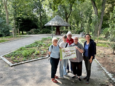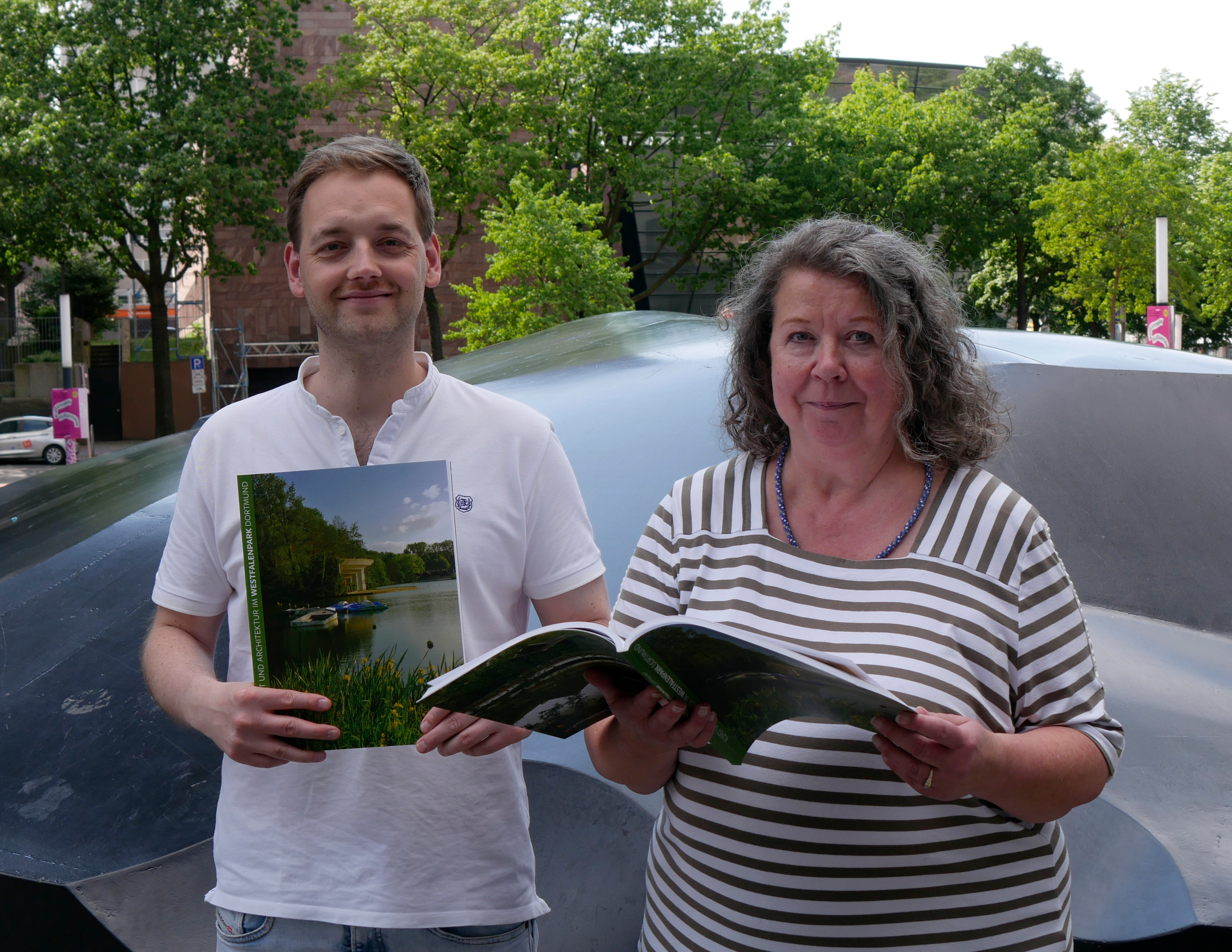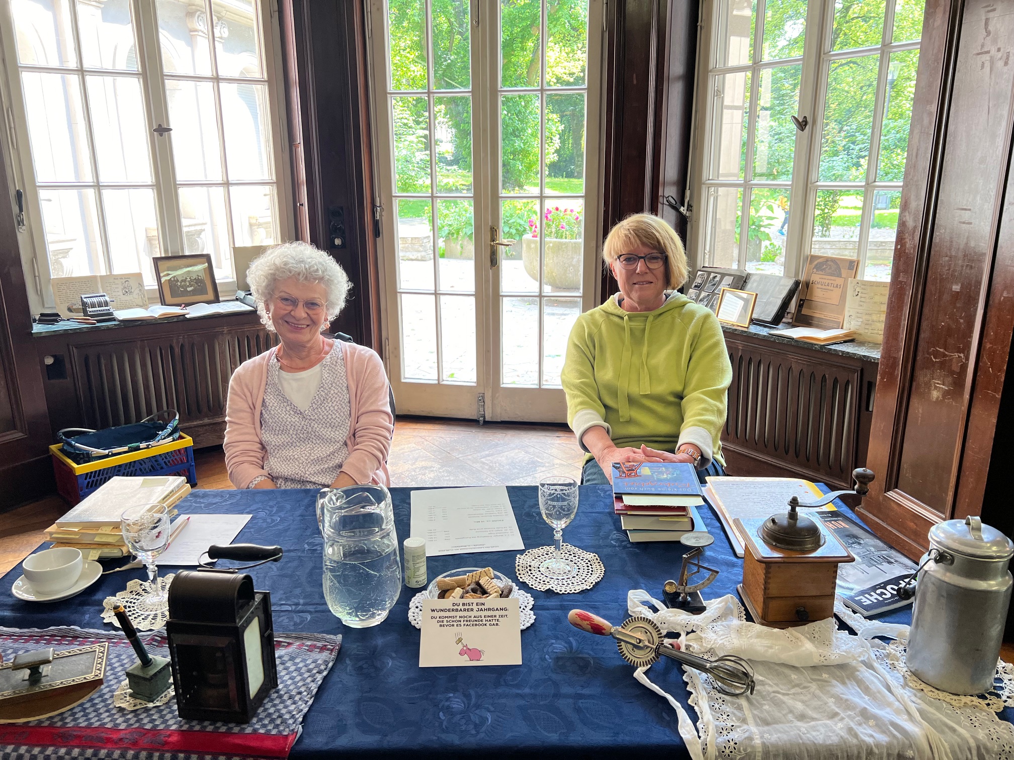 Annette Kulozik, Leiterin Geschäftsbereich Parkanlagen bei Sport- und Freizeitbetriebe Stadt Dortmund, die mit ihrem langjährigen Engagement den Westfalenpark geprägt hat und nun in den Ruhestand geht, empfängt aus den Händen von Petra Wagner, Kassiererin am Eingang Ruhrallee, das neue Programmheft.