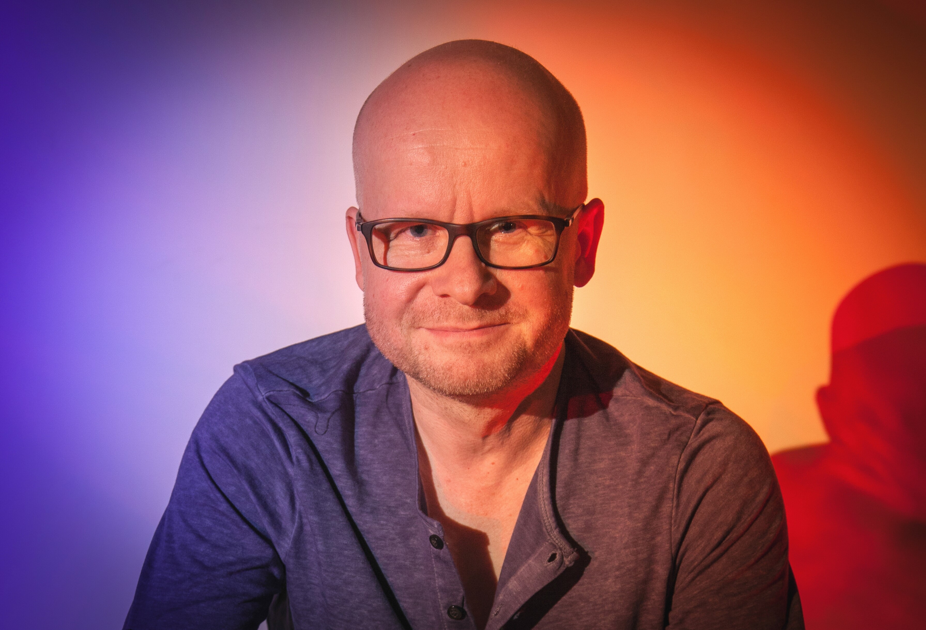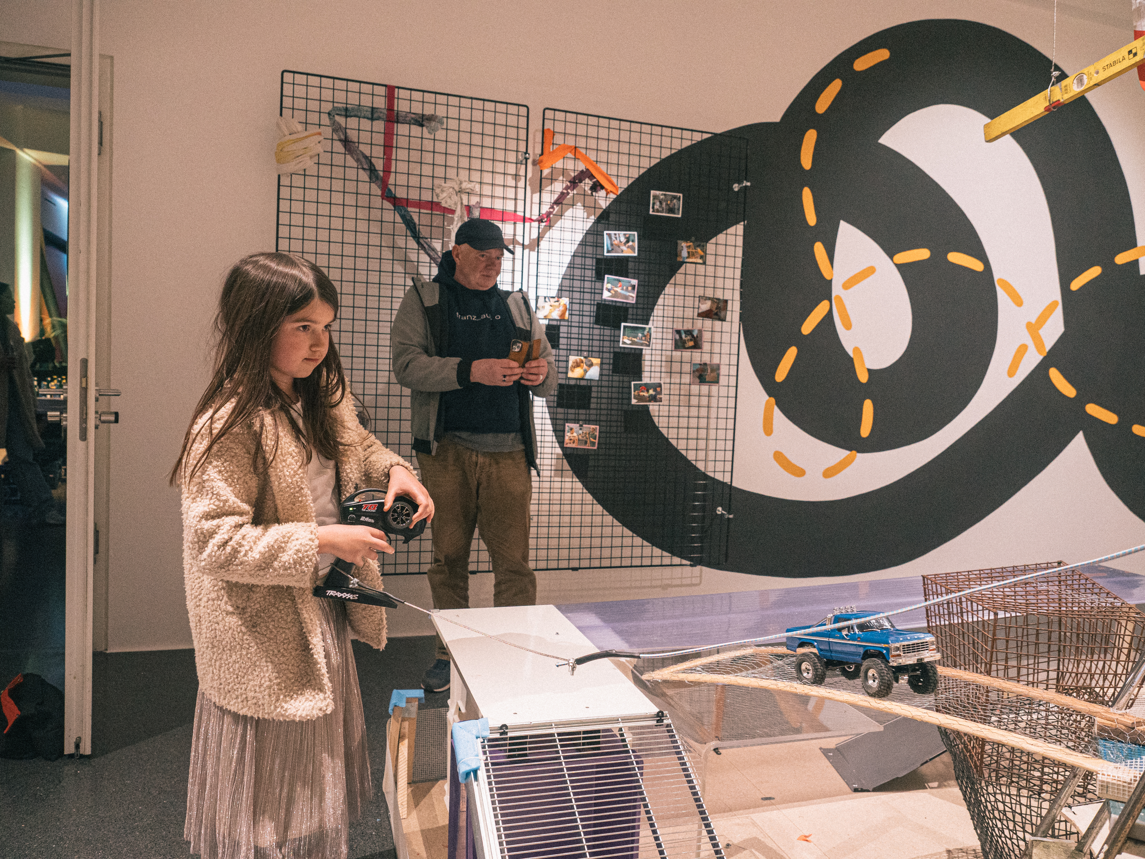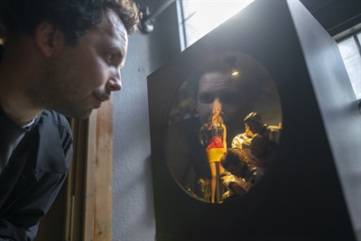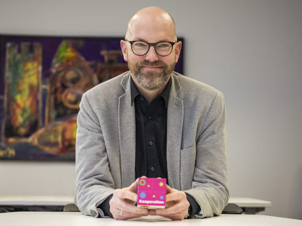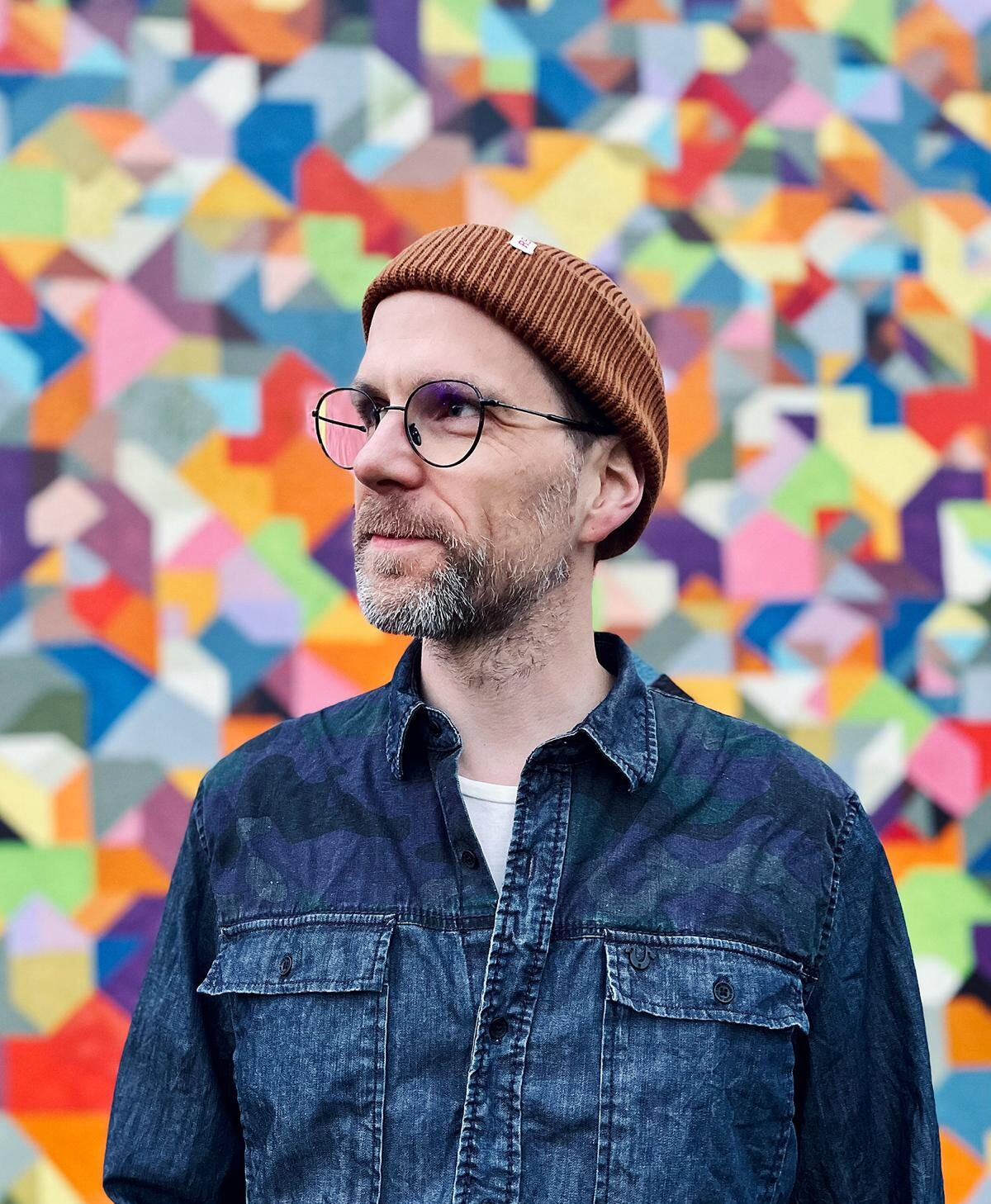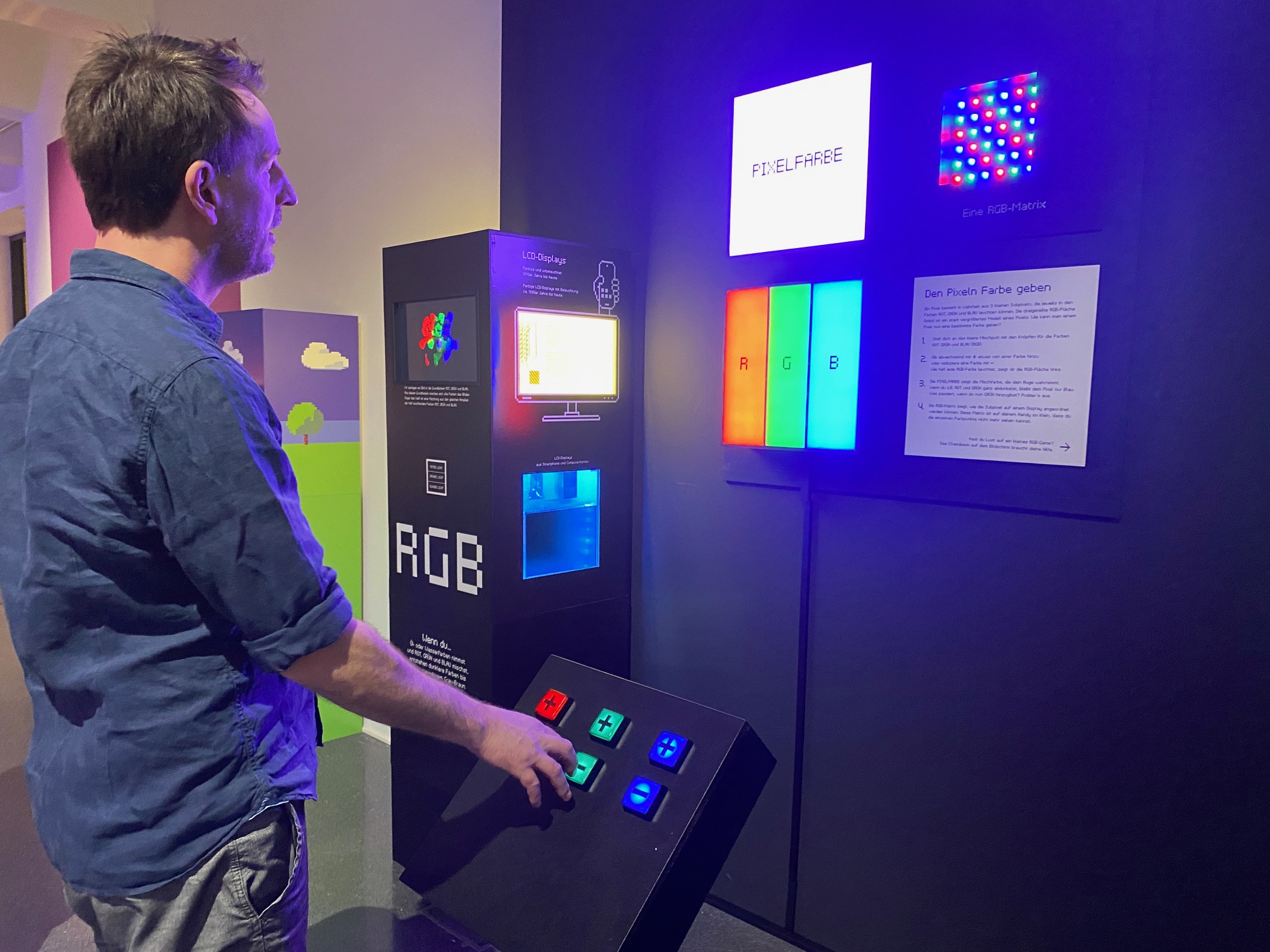 "Pixelfieber"-Ausstellungsmacher Dirk Mempel an einer Mitmach-Station zum Thema Grundfarben.