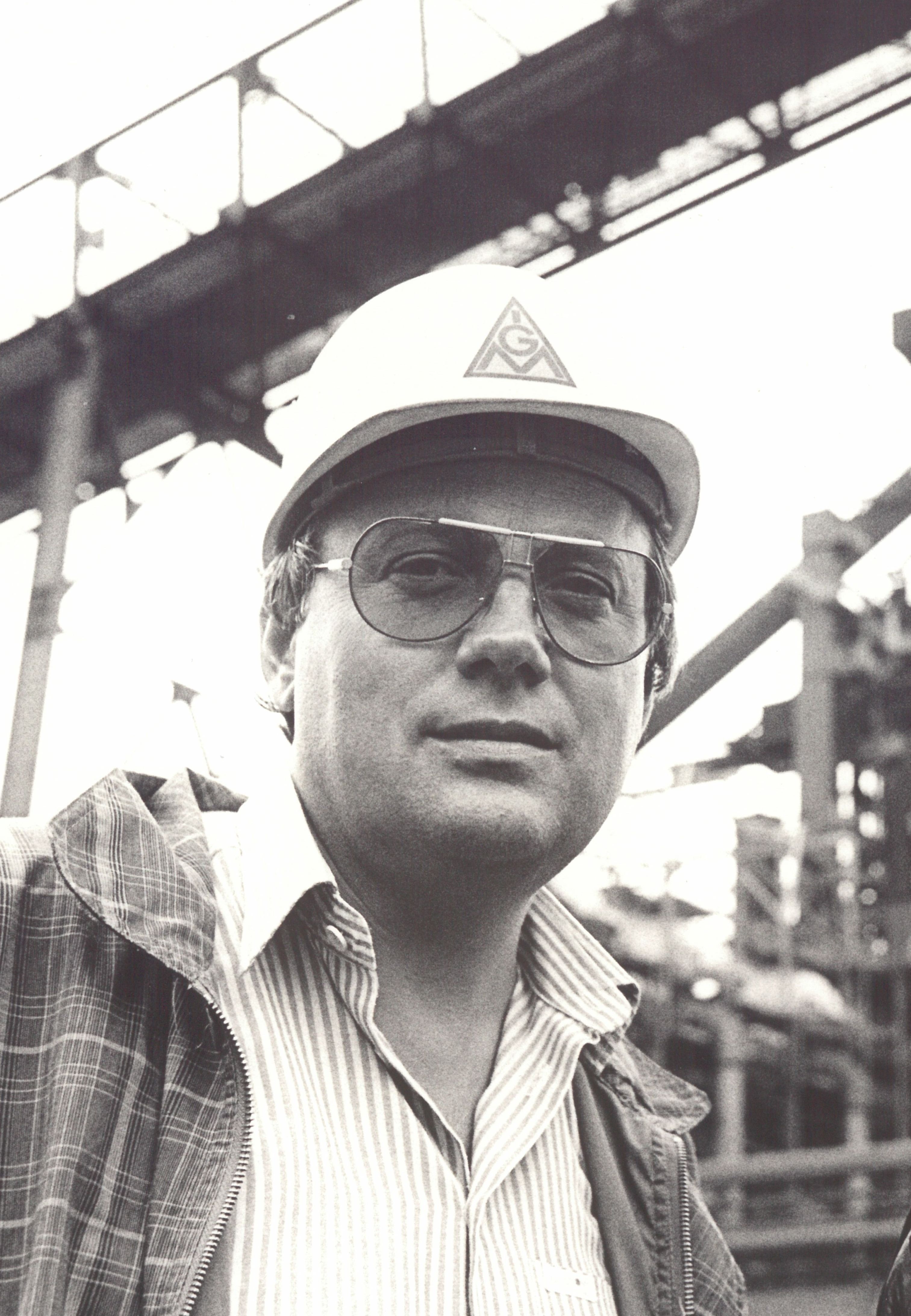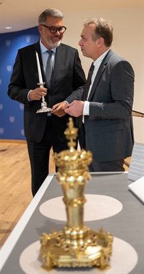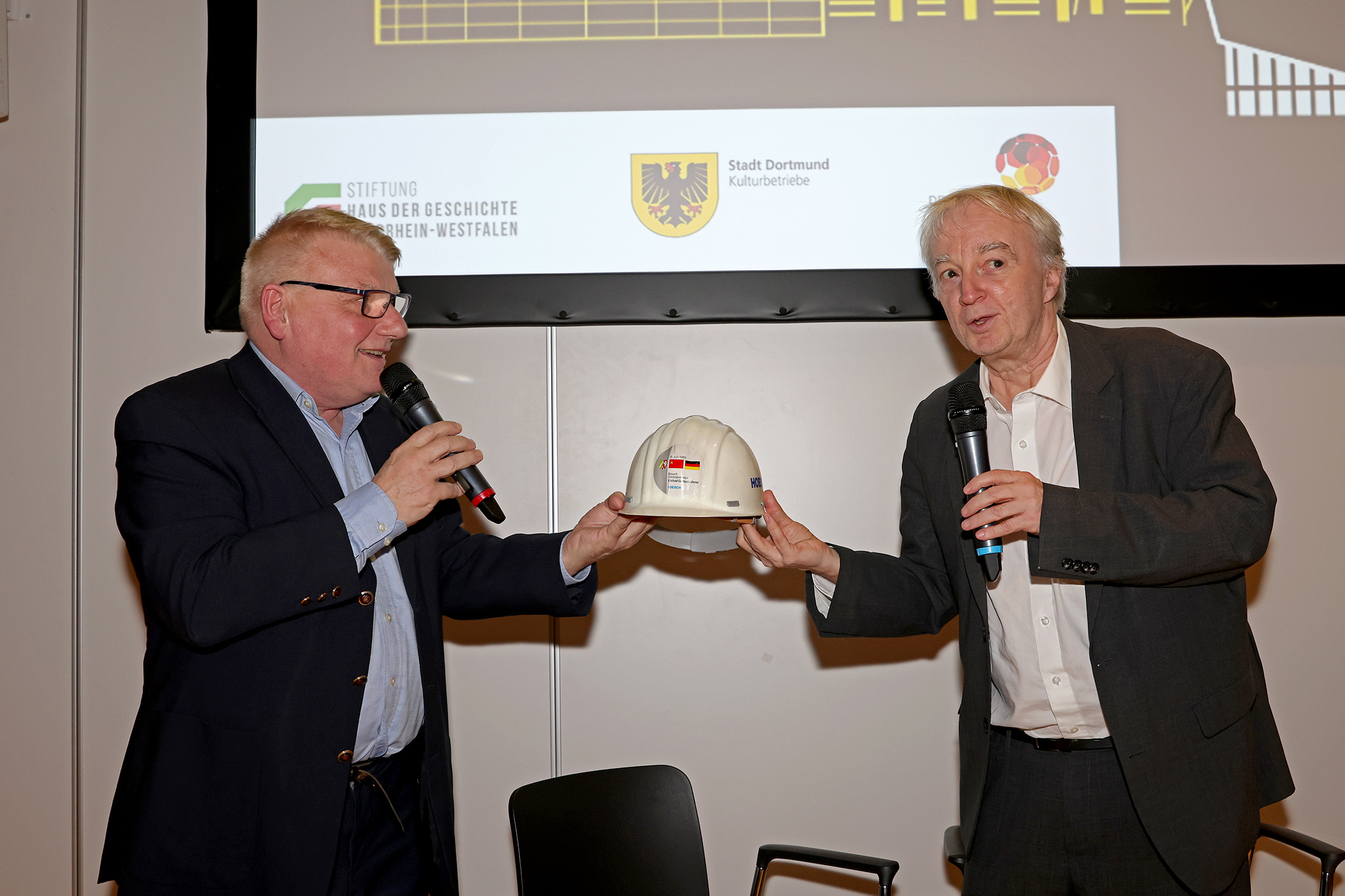 Dortmunds Bürgermeister Norbert Schilff (links) überreicht Heinrich Theodor Grütter, Präsidiumsmitglied der Stiftung Haus der Geschichte Nordrhein-Westfalen, einen Helm der Dortmunder Hoesch AG, den ein Mitarbeiter am 5. Juni 1989 anlässlich des Besuchs von Michail Gorbatschow im Eisen- und Stahlwerk trug.