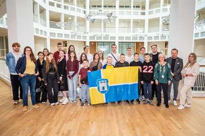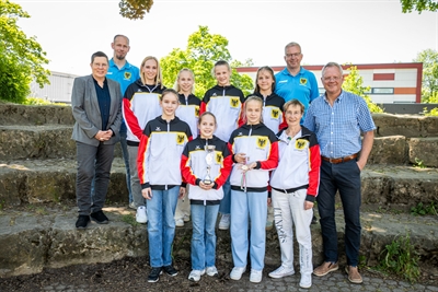 Neue Outfits für die Schüler*innen des Max-Planck-Gymnasiums, die an den Deutschen Schulmeisterschaften teilnehmen. Auf dem Foto neben dem Team (v. li.): Carsten Schmidt (komm. Schulleiter MPG), Dirk Rosenthal (Ausschuss für den Schulsport), Heike Waldmann (Mannschaftsbetreuerin), Amin Hadifar (Mannschaftsbetreuer), Ute Mais (Bürgermeisterin), Henrik Ziethoff (Ausschuss für den Schulsport)